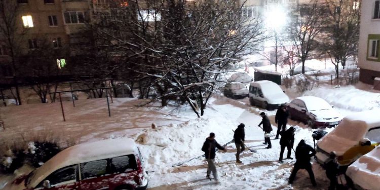 Сьогодні, 11 лютого, у вечірню пору, спершу двоє чоловіків вийшли з лопатами, бо не могли виїхати власними автомобіляи з двору.