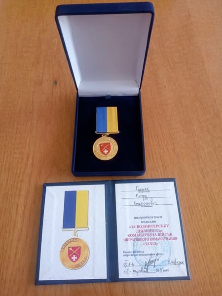 Петро Гурняк отримав медаль За волонтерську діяльність. Волонтер із 2014 року та фахівець відділу планування, супервізії та аналізу заходів ветеранської політики Петро Гурняк удостоєний почесної нагороди — медалі «За волонтерську діяльність». Відзнаку вручили з нагоди десятиріччя створення Оперативного командування «Захід».