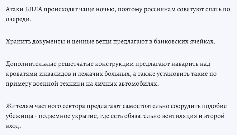 “Комсомольська правда” рф поширила пам’ятку МНС рф, де рекомендує мешканцям у випадку атак БПЛА ховатись слідом за домашніми тваринами, спати по черзі, бігти в сторону кордону з Україною, «заварити» інвалідів у металеві конструкції та захистити автомобілі каркасом, як військову техніку.