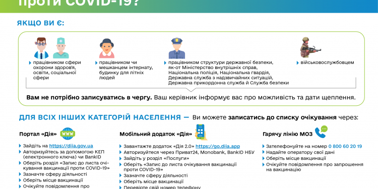 Зараз триває перший етап. Втім, навіть якщо ви не є медиком або військовим, ви вже можете записатися до черги на щеплення проти COVID-19 та чекати на повідомлення про початок вакцинації вашої групи.