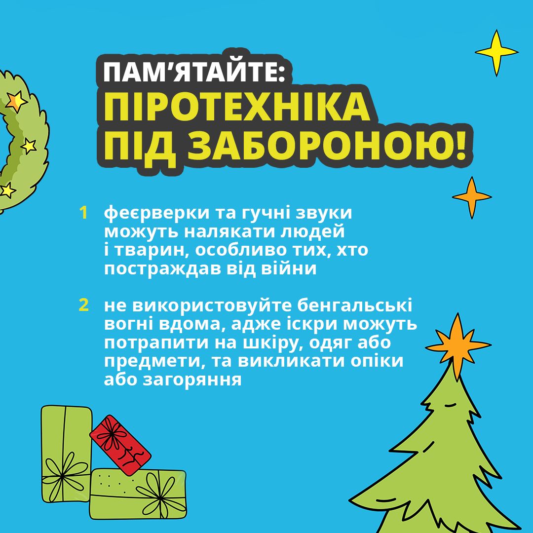 Памʼятайте, що в Україні діє заборона на використання піротехніки. Гучні звуки можуть лякати людей і тварин, які переживають жахи війни.