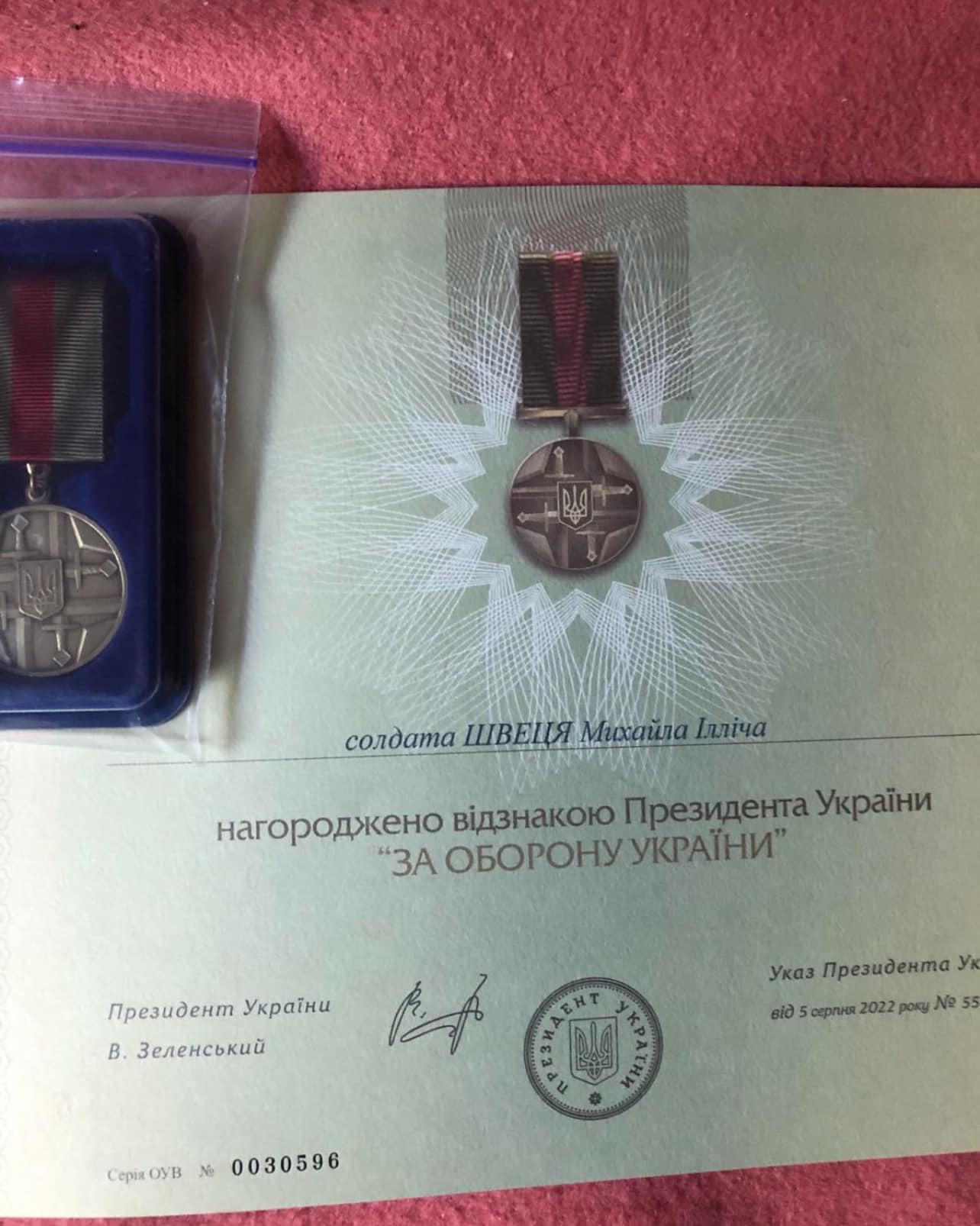 Наш земляк Швець Михайло Ілліч, солдат вогнеметного батальйону 704 полку РХБ захисту, який з 22 квітня 2023 року захищає Україну, відзначений високою державною нагородою – відзнакою Президента України «За оборону України». Ця нагорода є свідченням його мужності, професіоналізму та відданості військовій справі.